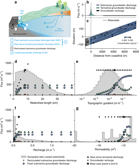 First, we performed a sensitivity analysis of submarine groundwater discharge by varying watershed length, topographic gradient, groundwater recharge and permeability in a range covers the values found in the geospatial analysis (Supplementary Fig. 2; Supplementary Table 3). The sensitivity analysis consisted of a total of 130 model runs. The parameters ranges are shown in Supplementary Table 4. The base case model used the median watershed length and groundwater recharge from the geospatial analysis, and a higher permeability (10−12 m2) and topographic gradient (2.5%) than the median watershed to better show the sensitivity of coastal groundwater discharge to the various parameters. In addition to the results shown in Fig. 1 we tested the effect of a realistic range of values of aquifer thickness, permeability anisotropy, and longitudinal dispersivity, which are variables for which no geospatial data was available. These additional results are shown in Supplementary Fig. 13 and discussed in Supplementary Note 2 and confirm that although these parameters are important, permeability and topographic gradient are by far the most sensitive parameters for coastal groundwater discharge.