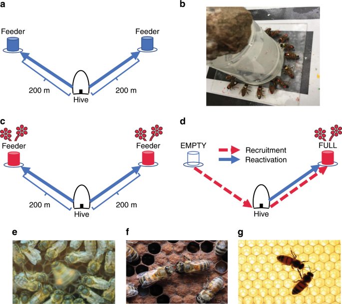 Our experimental design followed a dual-feeder set-up, whereby one cohort of bees (FULL group) were trained to a feeder that offered rewards throughout training and testing, while a second (EMPTY group) visited a feeder that became unrewarding after training (Fig. 1). During testing, the EMPTY group thus provided a pool of marked, motivated bees that were unemployed and amenable to recruitment within the timeframe of our experiment. Working with one colony at a time (n = 4 colonies), we trained the two cohorts (18–30 individuals per group) to their respective feeders over 4–9 days (depending upon weather conditions) following standard protocols1,51. During training, newly arrived unmarked foragers were individually marked at the feeder with enamel paints (Humbrol®; Fig. 1b). Subsequent in-hive visual observation served to confirm whether newly marked individuals belonged to the focal colony. Any individuals not observed in the hive were captured upon returning to the feeder and later frozen, thereby preventing non-focal colonies from interfering with or outcompeting our focal cohorts at the feeders.