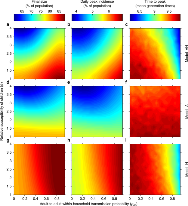 The transmission component of the model is parameterised in terms of ψ and ϕ, which represent respectively the relative susceptibility and infectivity of children versus adults, and total infectivities βx. In practice, the within-household total infectivity βh is re-parameterised in terms of paa, defined as the probability that a randomly selected susceptible would be infected directly by a single initial household case, in a randomly selected household with at least two individuals, when adults and children have the same susceptibility and infectivity (ψ = ϕ = 1). In other words, paa is obtained by first computing pn = 1 − exp(−βh ∕(n − 1)) and then averaging pn over the size distribution of a randomly selected household with at least two members. Other similar choices would have been possible, as long as they do not depend on other parameters we are exploring independently, like ψ or ϕ. In the Supplementary Discussion (Sections 2.1.1 and 2.2.1) we comment on more aggregate, but more intuitive epidemiological quantities, such as the SAR or the fraction of total transmission occurring in households. The latter is measured as (left({R}_{0}-{R}_{0}^{g}right)/{R}_{0}), where ({R}_{0}^{g}) is the dominant eigenvalue of Kg, and reveals that, at least for the H1N1 2009 pandemic influenza in Great Britain, approximately a third of the total transmission occurs in household (a rule of thumb suggested before8,9,32; see Supplementary Discussion, Sections 2.1.1 and 2.2.1).